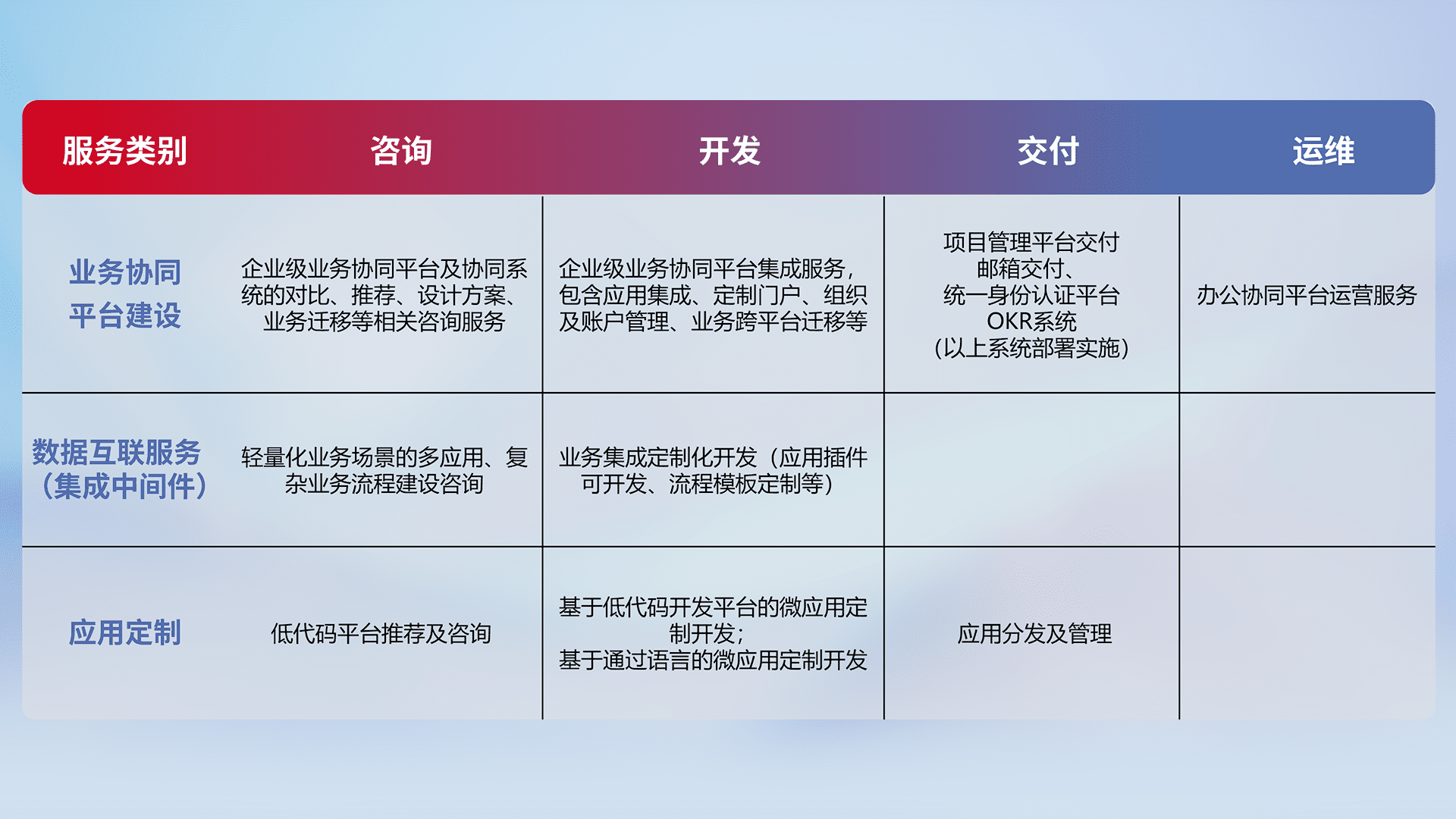 针对钉钉、、、、企微、、、IDaas等平台级产品提供产品的规划、、方案、、、交付、、、、定制化开发等服务,,,实现如统一协同办公、、智能客户服务、、、混合会议管理、、智能数据查询、、、、等业务场景,,实现数字化转型。。。。